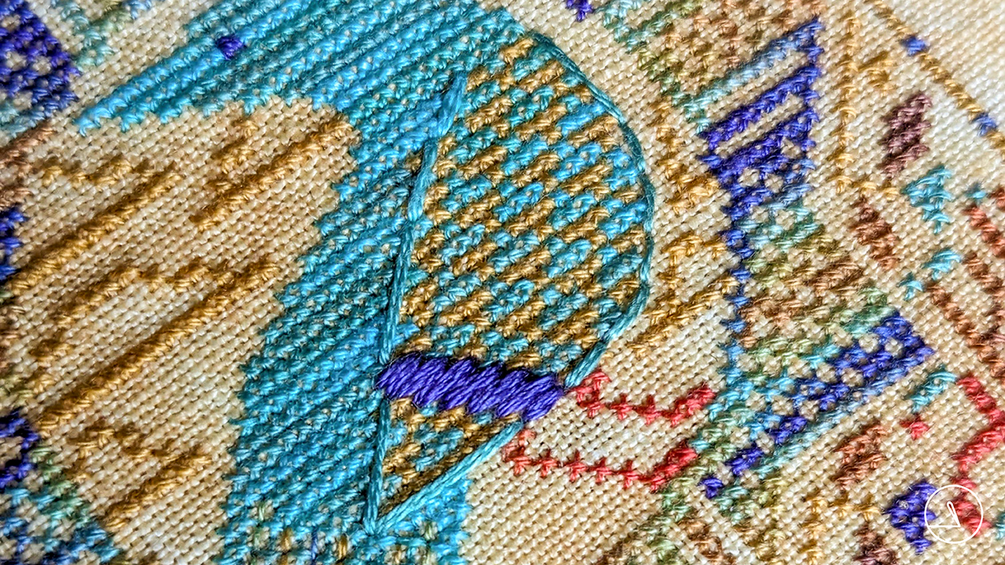 Model stitched 1 pulled strand over 2 fabric threads on 40 count Sunshine Days linen by Lapin Loops.