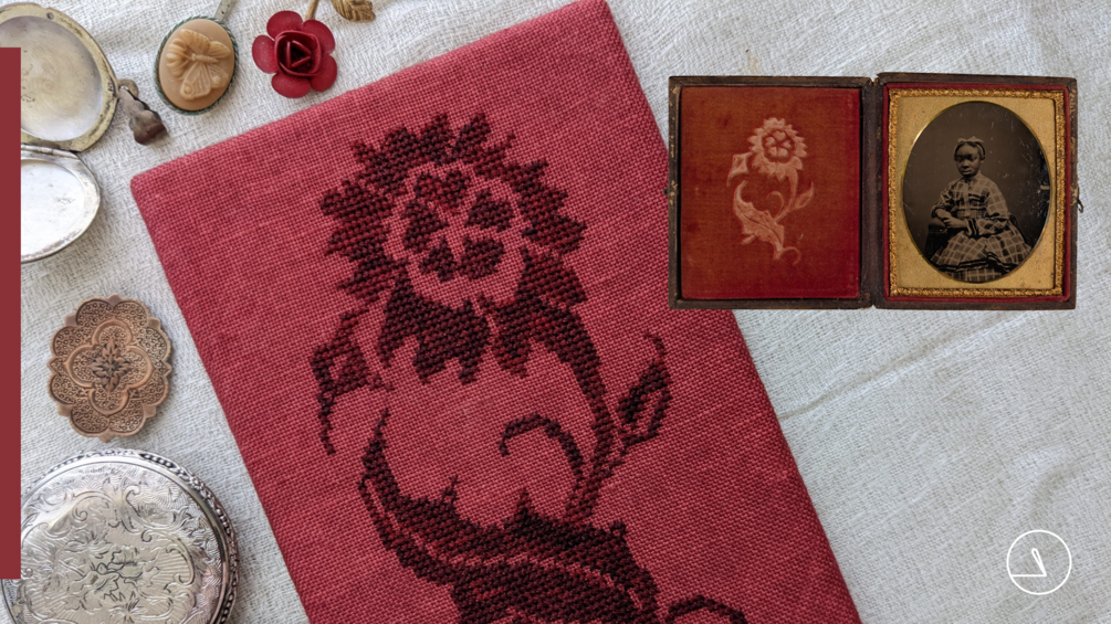 Inspired by a cased tintype* found in the Smithsonian National Museum of African American History and Culture (NMAAHC) online archives, this semi-reproduction interprets the flower motif embellishment that’s embossed into the velvet on the left side of the case.