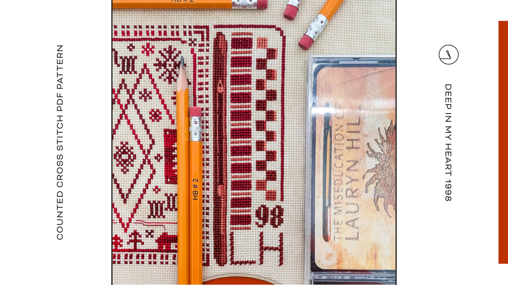 The pencil in wooden desk groove from the classic album cover art is depicted in this stitch, accompanied by an interpretation of the pattern in the scarf Ms. Hill wears in the photos throughout the album booklet. Each square in the rightmost section represents each of the 16 tracks on the album, with different floss colors to highlight interludes, features by other artists, and hidden tracks.
