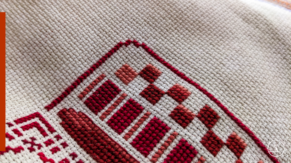 Model stitched 2 and 4 pulled strands over 1 fabric thread on 17 count Latte aida by Fiber on a Whim.