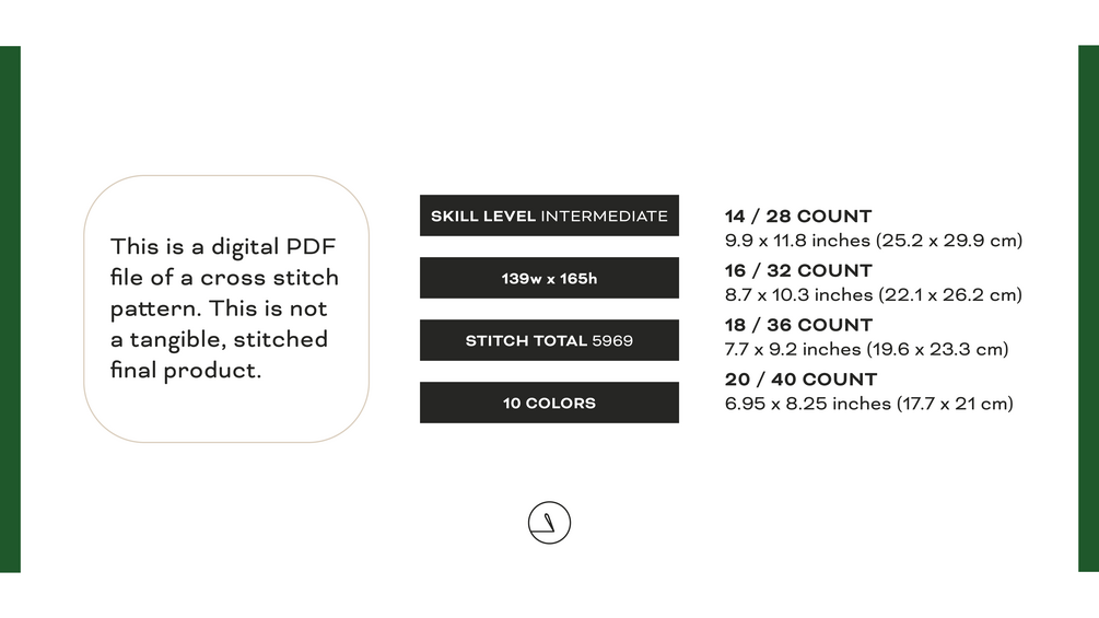 This is a digital PDF file of a cross stitch pattern. This is not a tangible, stitched final product.